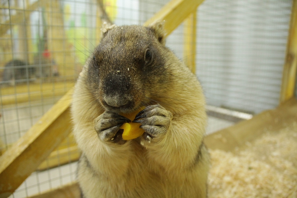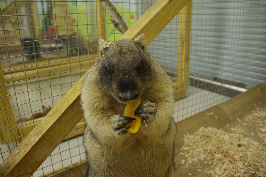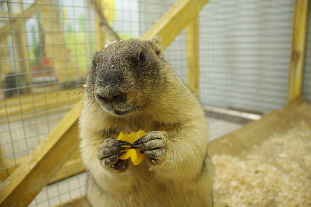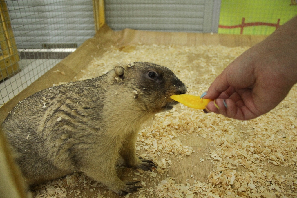 — У нас есть сурок Фил. Он немного диковатый, приехал к нам из другого такого же зоопарка. По возрасту, если переводить на человеческий, он мужчина сорока лет. Вид грозный, конечно. Фил, иди сюда, позировать будем, — говорит она и протягивает очень полному сурку кусочек желтого болгарского перца, который он весьма охотно и аккуратно берет передними лапами, присаживаясь на задние, и начинает есть.