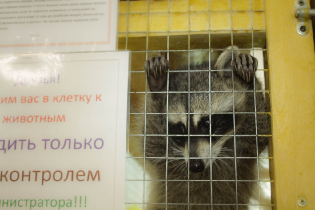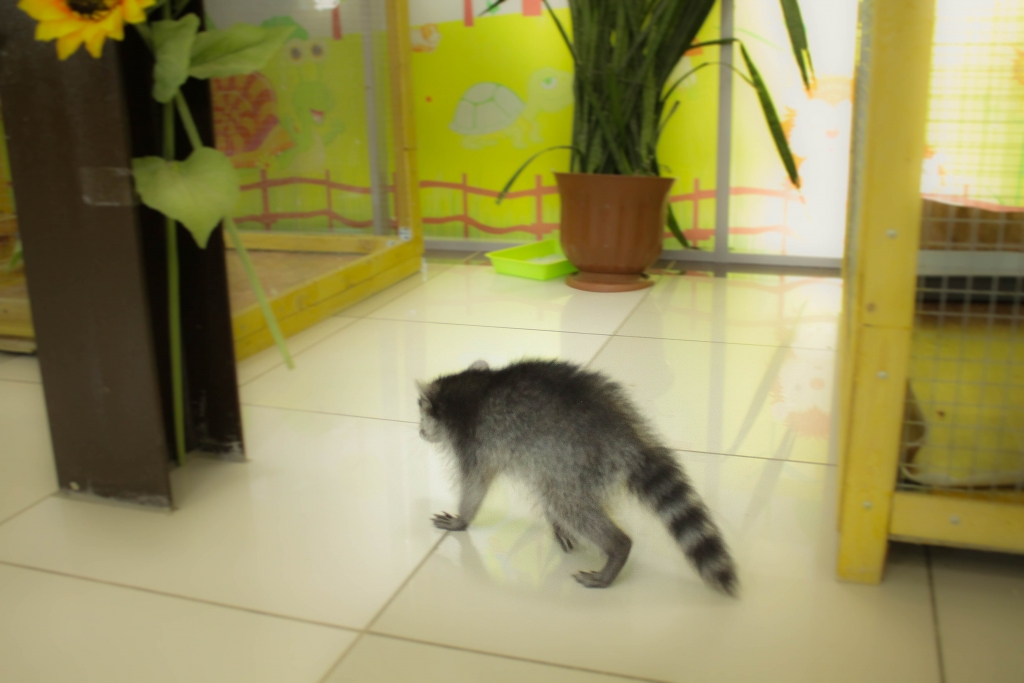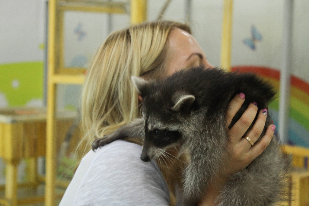 Как только открылась дверь их вольера, еноты испарились – Кроха выпрыгнула, но остановилась, а вот Арчи начал нарезать круги с невероятной скоростью и задорным характерным урчанием. Пока ловили Арчи, Кроху начали тискать посетители.