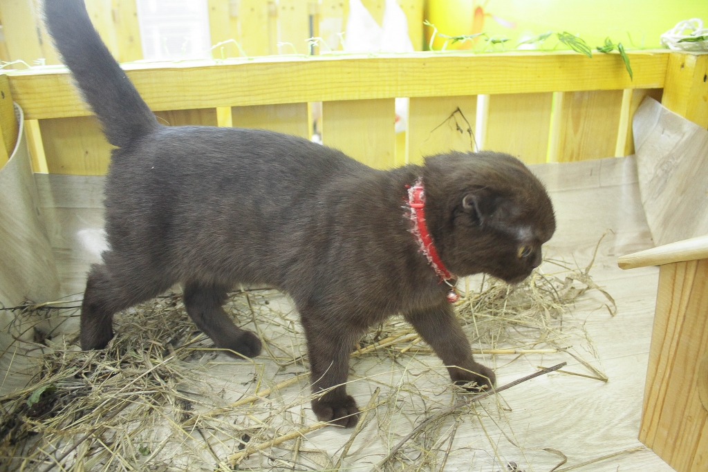 — Это Шоколадка, — рассказывает Лидия Левкович, — она у нас очень любопытная и общительная. Кстати, ее характер совсем не похож на темпераменты ее сородичей – скоттиш-фолдов или шотландских вислоухих кошек. Шоколадка, моя хорошая, иди сюда! Она у нас элитная кошка, у не все есть – хороший корм, специальный лежак, но иногда она может уснуть у кого-то в вольере, измазавшись опилками, как самая обычная деревенская. Ей все надо, со всеми она дружит, везде лезет. И, когда каждый раз открывается дверь, Шоколадка норовит улизнуть. Иногда мы выпускаем ее гулять по этажу.