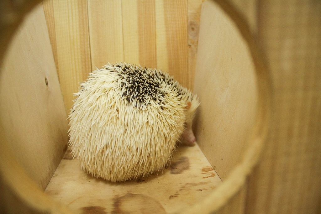 — Тут ежик. Хотите посмотреть? – спрашивает Лидия Левкович, поднимая крышку маленького домика в квадратном вольере с низким забором, — Сырочек, мой хороший, просыпайся.