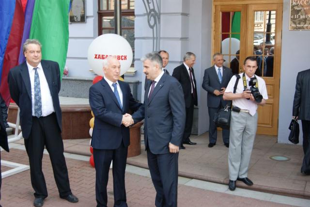 С поздравлениями со сцены хабаровской краевой филармонии к гостям и жителям города обратились мэр Хабаровска Александр Соколов, губернатор Хабаровского края Вячеслав Шпорт, архиепископ Хабаровский и Приамурский Игнатий, мэр города Биробиджана Виталий Пархоменко. От имени полномочного представителя президента в дальневосточном федеральном округе Виктора Ишаева к гостям обратился главный федеральный инспектор в Хабаровском крае Владимир Пригорнев. Все они пожелали Хабаровску роста и процветания, успехов в экономическом и социальном развитии.