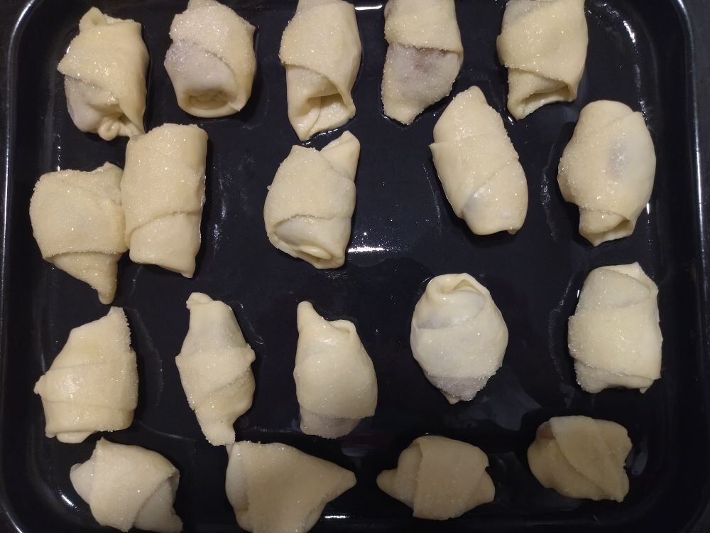 Противень смазать тонким слоем растительного масла, уложить рогалики на небольшом расстоянии друг от друга и отправить в духовку минут на 20 при температуре 200 градусов. Помните, что духовки у всех разные, поэтому наблюдайте. Как рогалики зарумянятся, значит готовы.