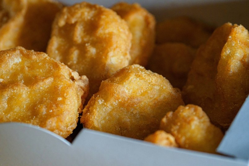 6. Если у вас отсутствует фритюрница, то можно пожарить наггетсы в обычной кастрюле или сотейнике с толстым дном. Для начала наливаем в выбранную посуду растительное масло и ждем, пока оно хорошенько раскалится. Затем осторожно, чтобы избежать ожогов, опускаем наггетсы в кипящее масло и обжариваем их со всех сторон. Обычно для этого достаточно двух-трёх минут;