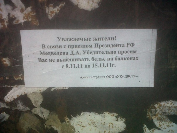 Хабаровск, 9 ноября, AmurMedia. Хабаровчан призывают на время визита президента не развешивать выстиранное белье на балконах, сообщает РИА AmurMedia со ссылкой на страницу Europa plus_khv в социальной сети "ВКонтакте".
