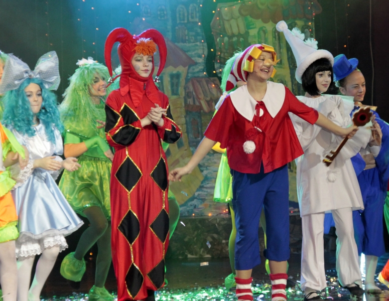 Праздничное шоу началось с театрализованного представления по мотивам сказки "Золотой ключик, или Приключения Буратино", подготовленного артистами краевого Дворца культуры.