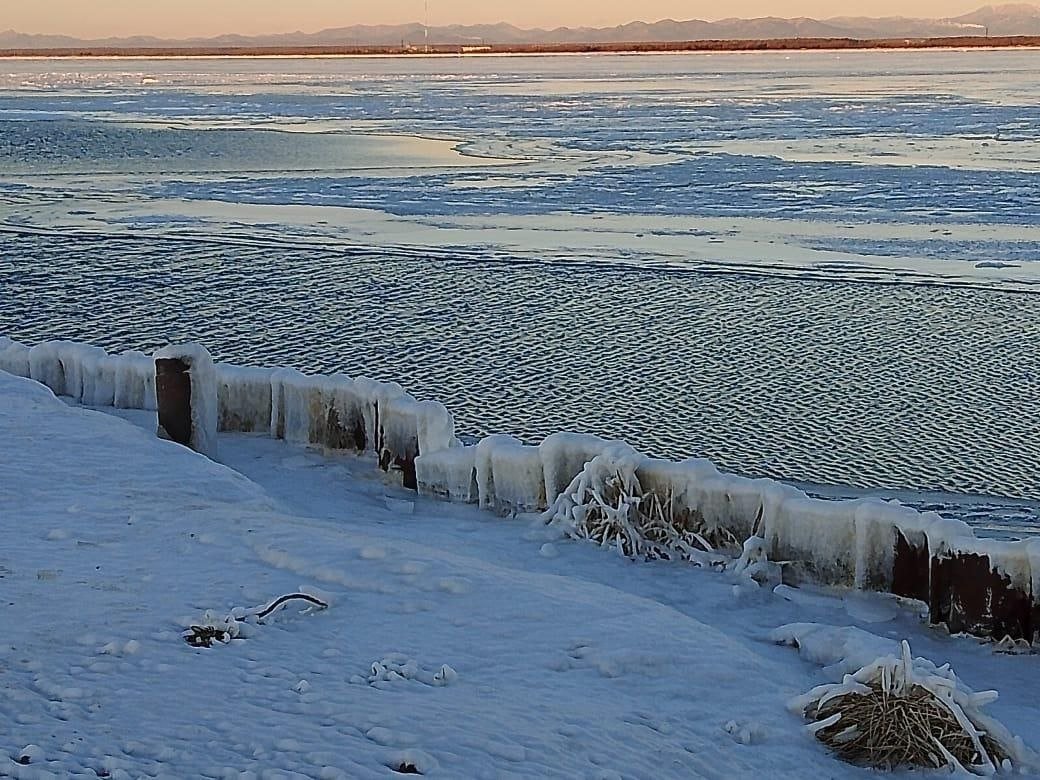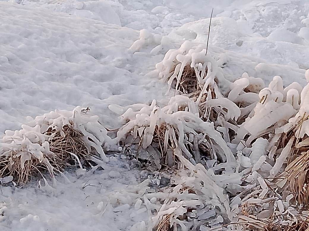 Но самые захватывающая картина проявляются в месте слияния соленой и пресной воды — в устье реки Кухтуй. Здесь мороз, влажность и ветер выступают в роли талантливых ваятелей. Каждая травинка, каждая ветвь прибрежного ивняка и сухая растительность преобразились в произведения искусства.