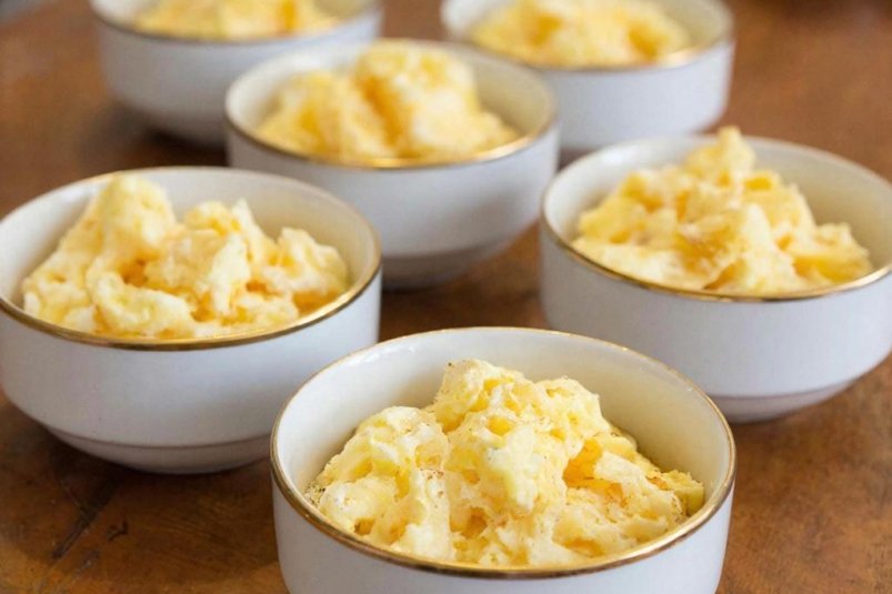 Смесь нагреть до загустения. Половину смеси сразу влить в ёмкость с сырыми яйцами, перемешать и вылить обратно.