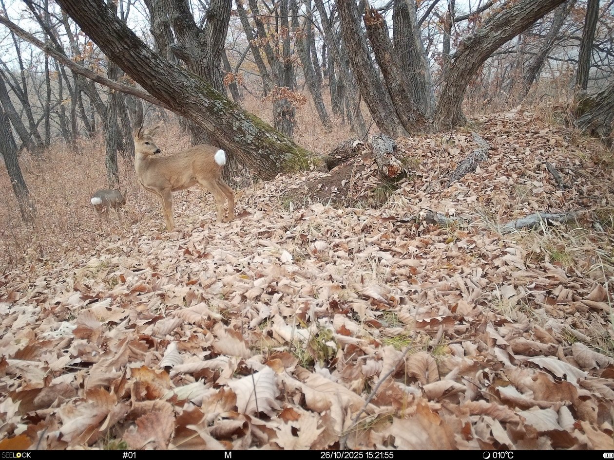 Также, в один из осенних дней, в зоркий объектив попалась осторожная рысь, проверяющая барсучьи норы. Грациозные косули кормились в зарослях леспедецы в октябре, стараясь не шуршать дубовыми листьями, чтобы не привлечь внимание не званных "гостей".