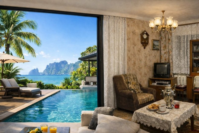 В пабликах демонстрируют контрастные кадры: на одном фото — обветшалая "хрущевка" с "бабушкиным" ремонтом, на другом — современная недвижимость в Таиланде с бассейном. Авторы утверждают, что и то, и другое доступно за 4 млн рублей.
