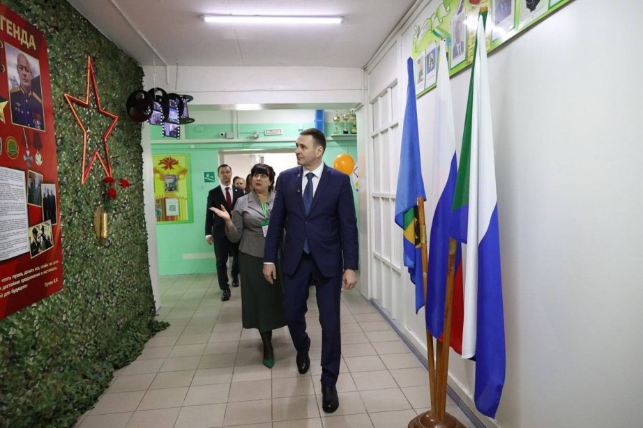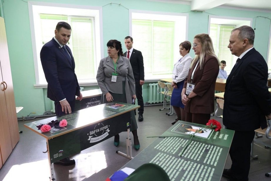 Школьники рассказали главе региона о подвиге Сергея Полякова — выпускника школы. Командир 14-й отдельной гвардейской бригады специального назначения, полковник Поляков погиб во время выполнения боевых задач в ходе специальной военной операции. Указом Президента за мужество и героизм ему присвоено звание Героя Российской Федерации. Ученики также показали губернатору Парты Героев.