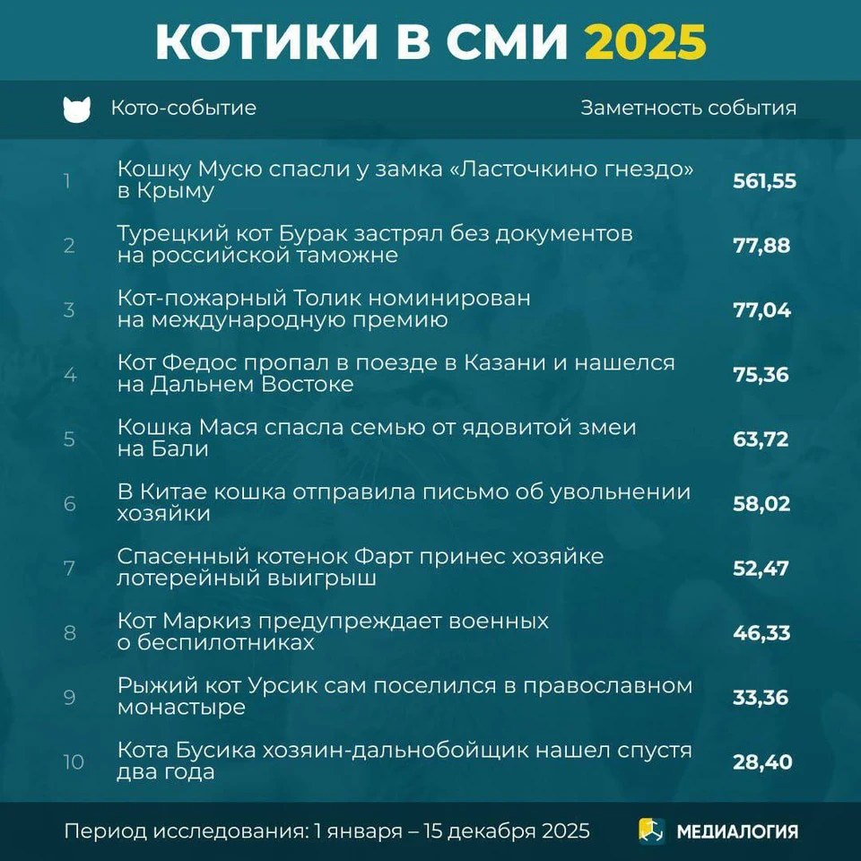 AmurMedia, 14 февраля. Год 2025 был богат на пушистых героев! Аналитики системы Медиалогия (16+) подвели итоги и составили рейтинг самых упоминаемых котов в российских СМИ с 1 января по 15 декабря. Мониторинг охватил более 107 тысяч источников, а позиции распределялись по суммарной заметности публикаций. В десятку попали самые обсуждаемые и любимые пушистые звёзды года. ИА AmurMedia с радостью делится этими героями и их невероятными приключениями.