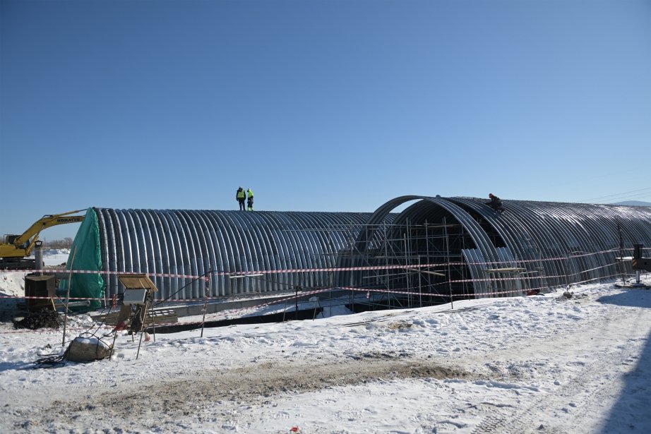 На пикете 28 продолжается устройство железобетонного ростверка — конструкции, распределяющей нагрузку от сооружения на сваи и повышающей его надежность. В условиях отрицательных температур выполнено около 88% от проектного объема. Здесь же ведется монтаж двухпролетной сводчатой части арочного моста из гофрированного металла: смонтировано свыше 150 тонн конструкций (более 85% от общего объема). После завершения работ этот каркас обеспечит безопасный проезд транспорта.