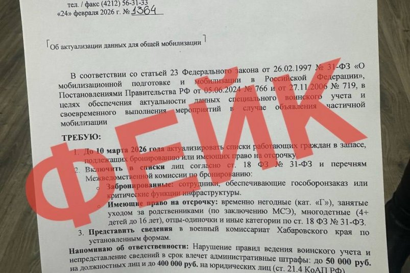 AmurMedia, 1 марта. В регионе распространяется копия якобы официального письма военного комиссариата Хабаровского края об "актуализации данных для общей мобилизации". Документ адресован руководителям предприятий и организаций и содержит требование предоставить списки сотрудников, состоящих в запасе.