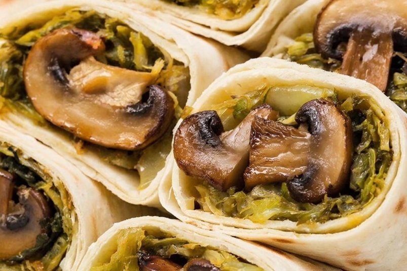 Всё просто, вкусно и постно. Тонкий лаваш сворачивают рулетом с начинкой из обжаренных грибов, квашеной капусты и лука. Рулет нарезают, укладывают в форму и заливают соусом из аквафабы — жидкости из банки консервированной фасоли. После запекания получается нечто вроде пирога.