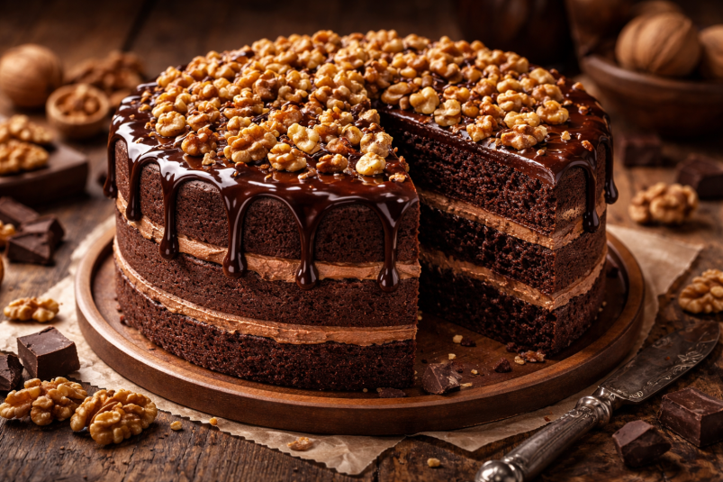 - Каждый слой смажьте кремом и посыпьте измельчёнными орехами. Верх и бока также покройте кремом. Срезанную верхушку измельчите в крошку и обсыпьте бока торта. По желанию можно добавить немного какао или орехов сверху.