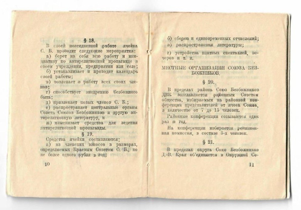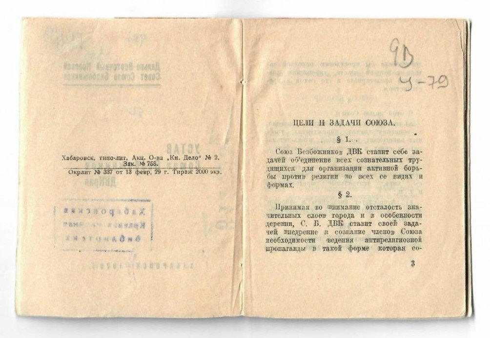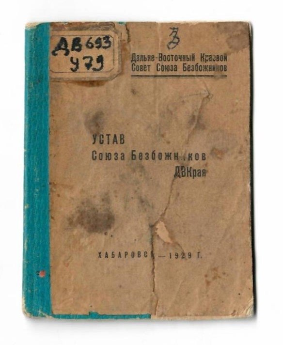 — Союз безбожников ДВК ставит себе задачей объединение всех сознательных трудящихся для организации активной борьбы против религии во всех её видах и формах, — говорится в уставе. — Принимая во внимание отсталость значительных слоёв города и, в особенности, деревни, С.Б.ДВК ставит своей задачей внедрение в сознание членов Союза необходимость ведения антирелигиозной пропаганды в такой форме, которая содействовала бы проведению основной задачи советской власти, укреплению диктатуры пролетариата и его союза с крестьянством.