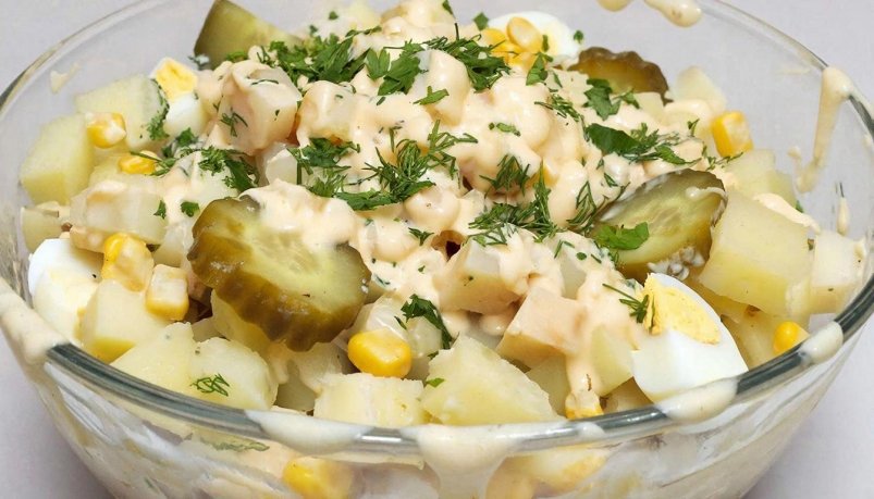 Комбинация картофеля, яиц, кукурузы и соленых огурцов рождает сбалансированное угощение с весьма интересным гастрономическим характером. В этом составе нежность основы подчеркивается сладостью кукурузных зерен, сочностью маринованных овощей и легкой остротой лука. Итоговый вкус формирует нестандартная заправка из смеси майонеза, сметаны, горчицы и сока лимона, в которую для баланса добавлена небольшая порция сахарной пудры.