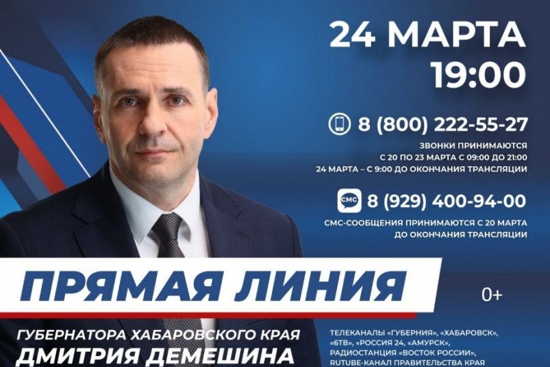 AmurMedia, 18 марта. 24 марта губернатор Хабаровского края Дмитрий Демешин ответит на вопросы жителей региона, а также представителей средств массовой информации. Прямая трансляция будет организована на телеканалах "Губерния" (18+, с сурдопереводом), "Хабаровск" (18+), "6ТВ" (18+), "Амурск" (18+), а также на радиостанции "Восток России" (18+) на волне 103.7 FM (765 AM). Кроме того, следить за эфиром можно будет на официальном Rutube-канале (12+) правительства края. Начало — в 19:00, сообщает пресс-служба губернатора и правительства Хабаровского края