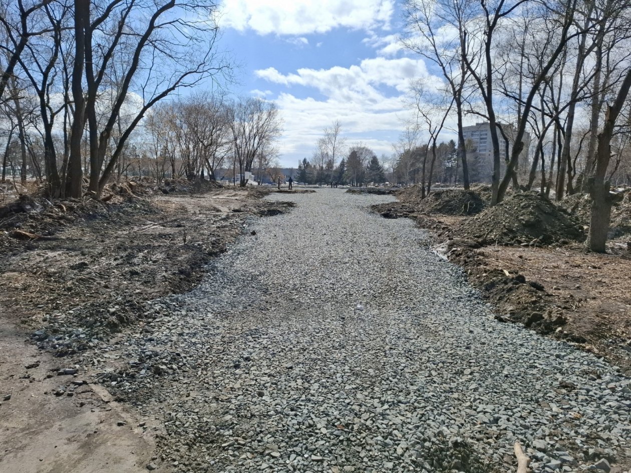 Местная подрядная организация с большим опытом благоустройства общественных пространств очистила территорию от аварийных деревьев и кустарников, спланировала её, выбрала грунт и приступила к отсыпке мест будущих дорожек крупным щебнем. На своей производственной базе подрядчик ведёт отливку брусчатки, делает скамейки и урны, готовится к заливке монумента; заказан гранит.