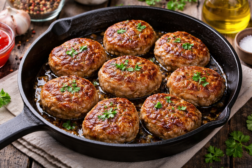 После этого сформируйте котлеты и приступайте к жарке. Благодаря этому простому приему блюдо получится более пышным, сочным и по текстуре будет напоминать ресторанное. Дополнительно можно слегка отбить фарш перед формированием — это сделает котлеты еще более мягкими и поможет им лучше держать форму.
