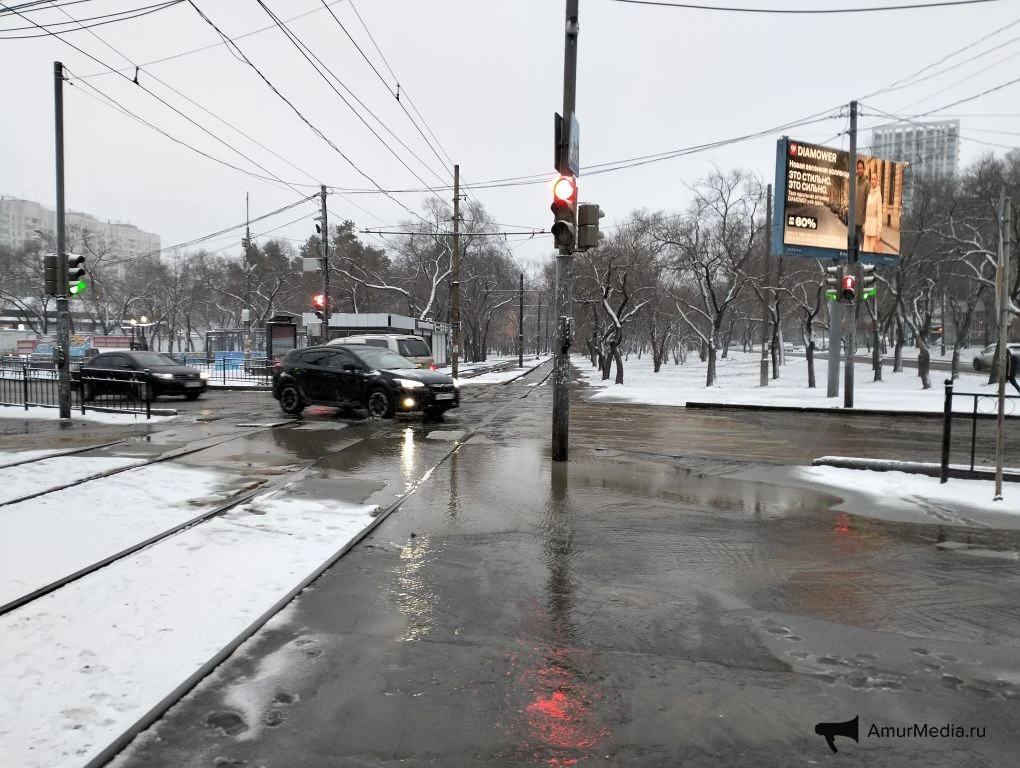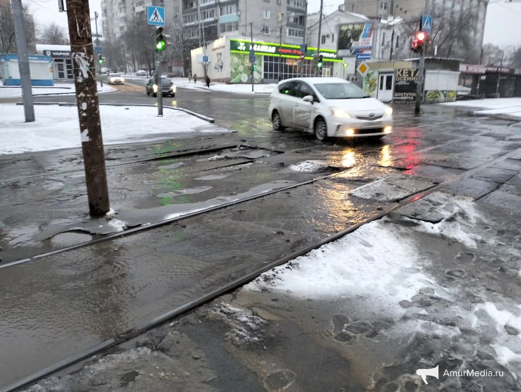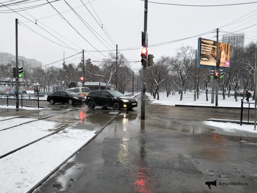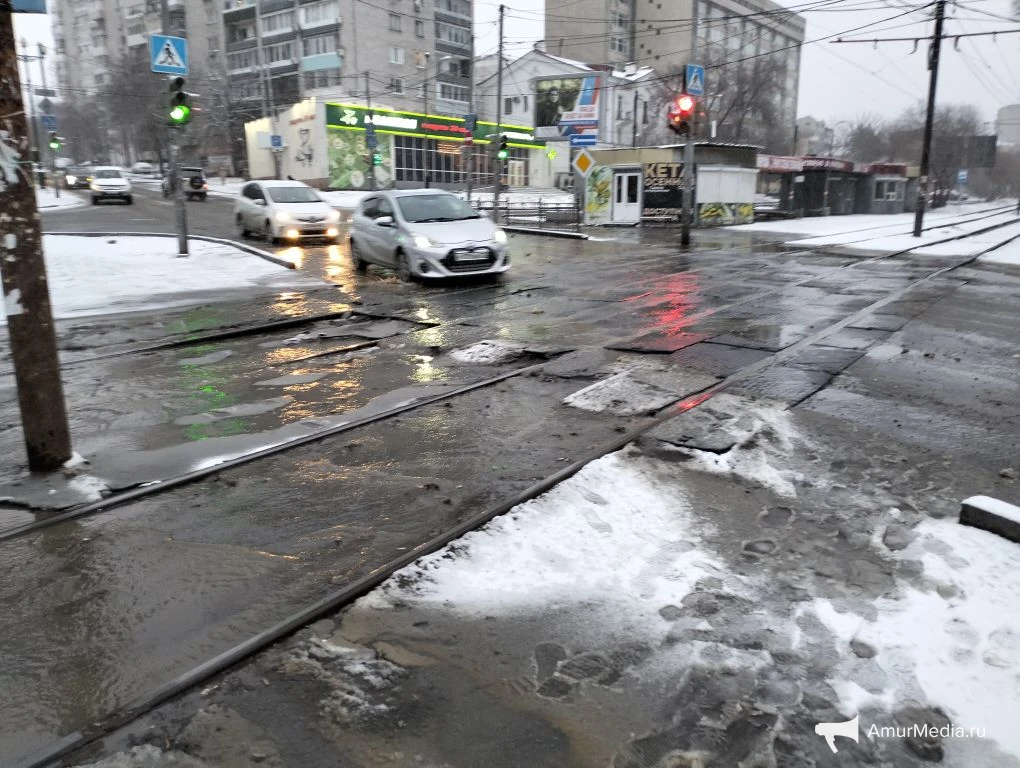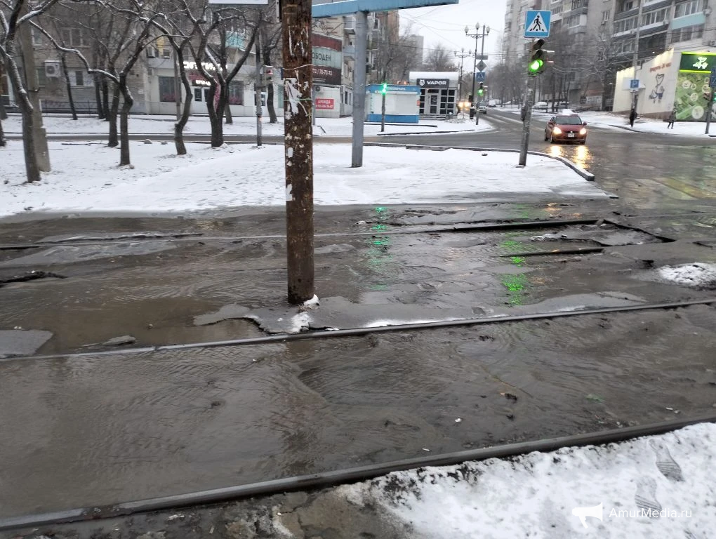 AmurMedia, 6 апреля. Сегодняшнее утро для многих началось не с кофе, а с очередной коммунальной аварии на пересечении Амурского бульвара и улицы Льва Толстого. Вода бежит по трамвайным путям, заливает улицу и дорогу. А тут ещё снег с дождём — настоящий квест, чтобы просто выйти из дома или дойти до работы.