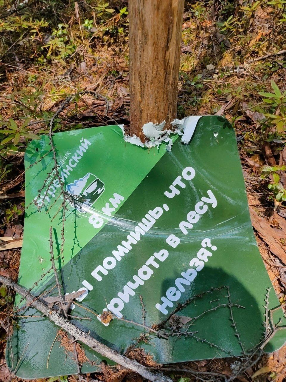 Хулиганом оказался взрослый бурый медведь, решивший, похоже, очистить охраняемую территорию от наглядной агитации и указателей.