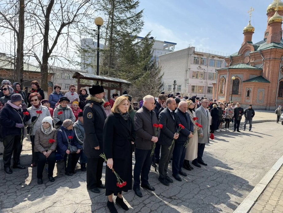 AmurMedia, 10 апреля. В Хабаровске прошла церемония возложения цветов к памятнику бывшим узникам фашистских концлагерей, который находится на территории храма Святителя Иннокентия Иркутского. Международный день освобождения узников фашистских концлагерей традиционно проходит 11 апреля. В этот день вспоминают об интернациональном восстании, поднятом в 1945 году узниками Бухенвальда, сообщает пресс-служба губернатора и правительства Хабаровского края