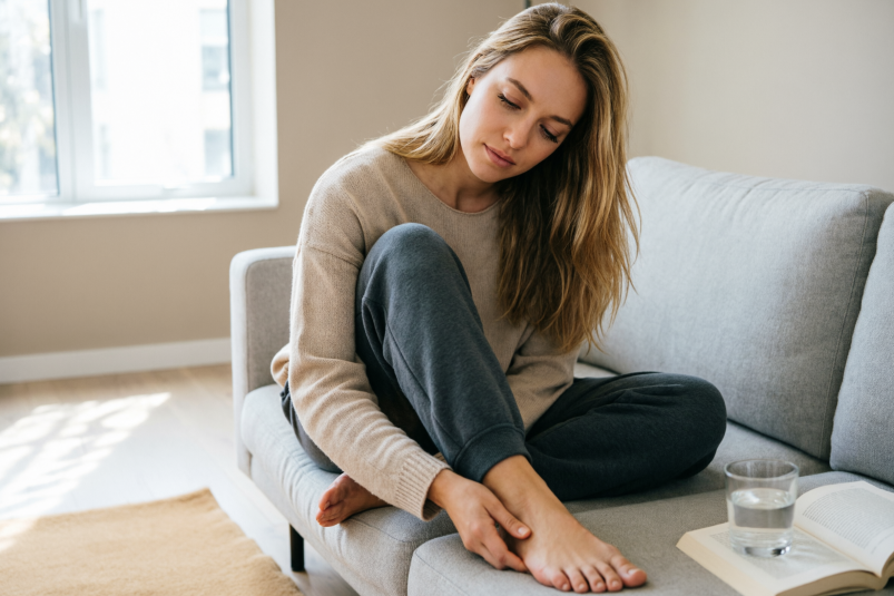 Скрестите ладони на щиколотках, мягко сожмите и проведите вверх к икрам, затем вниз к пальцам. Повторите круговые движения 5–6 раз. Техника разгоняет застой лимфы, согревает ткани и готовит ноги к ночному отдыху.