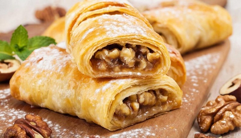 Рулеты готовятся на дрожжевом тесте, а грецкие орехи служат замечательной начинкой для этой сдобной выпечки.