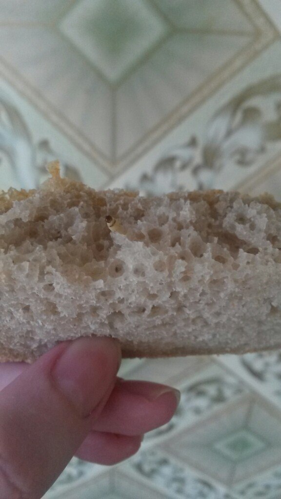 - Булку белого хлеба, производителем которого является "Колос-Пром", я купила в хлебном ларьке, расположенном в районе "Смайл Марта", рядом с магазином "Раз-Два". Отдала за буханку 30,5 рублей. Дома, во время обеда, я отрезала корочку хлеба и разломила ее пополам. На разломе, словно штырь, торчал червяк. Аппетит пропал сразу, пообедать не получилось, - рассказала Елена.