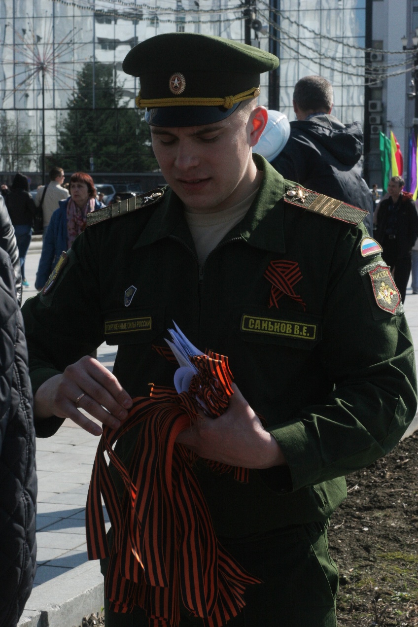 Пока звучала громкая концертная музыка все желающие фотографировались с военнослужащими, одетыми по форме военных лет, и приобретали сувениры с символикой Победы и Российской Федерации. А женщинам и девочкам заплетали косички студенты из технического колледжа.