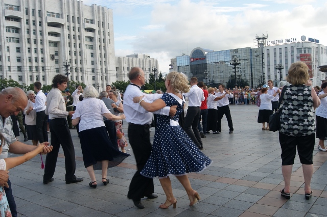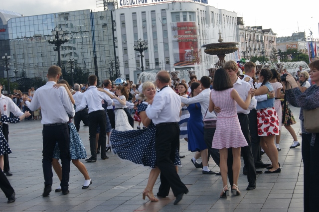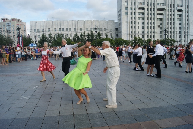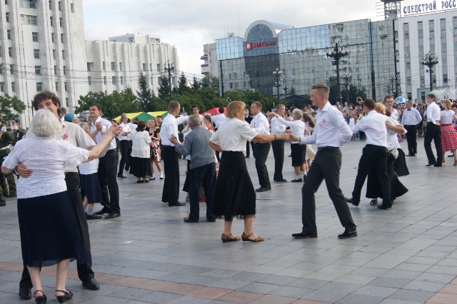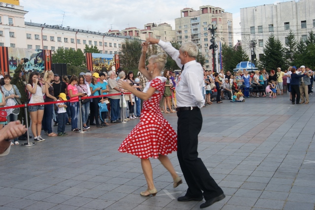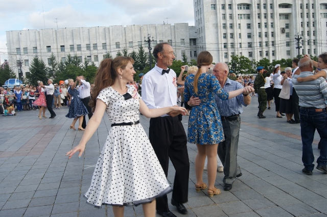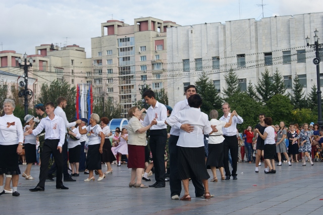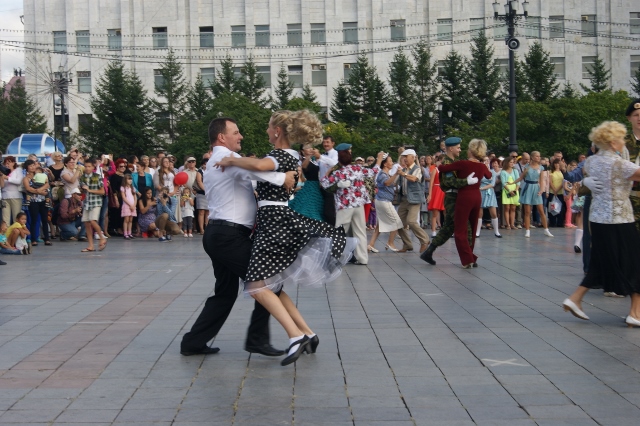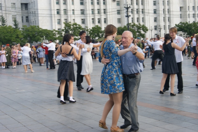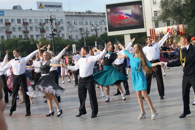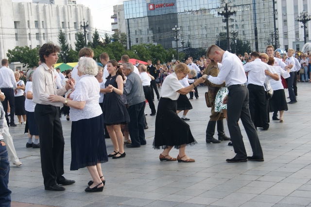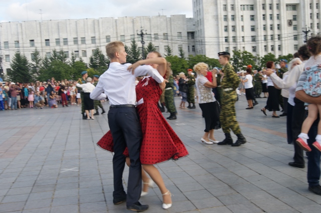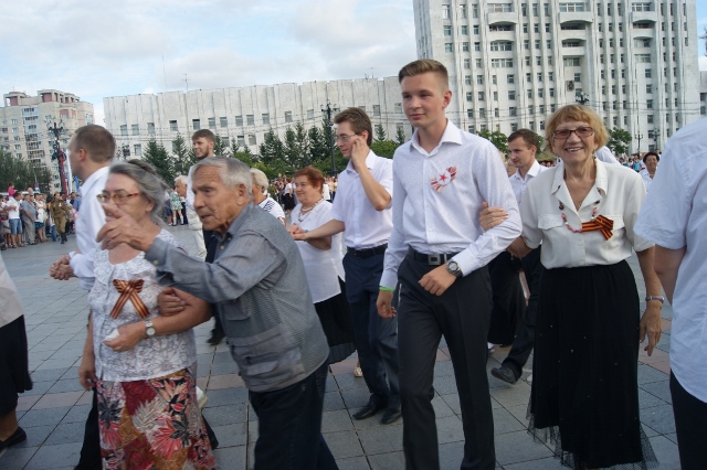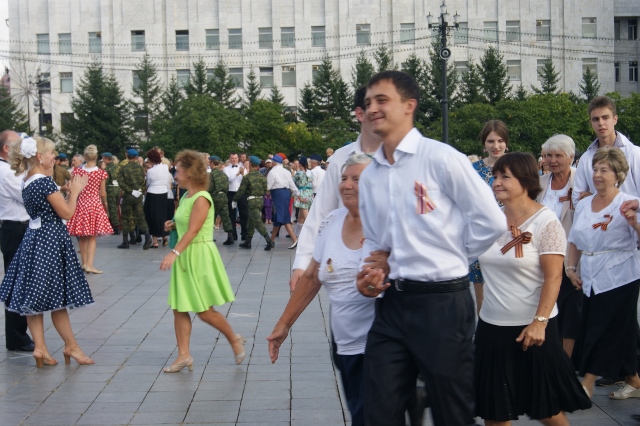 Мероприятия по случаю празднования 70-летия окончания Второй мировой воны продолжились массовым исполнением "Вальса Победы". Под звуки духового оркестра в танце закружились подготовленные пары, к которым потом присоединились все желающие, сообщает корр. ИА AmurMedia.