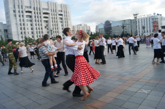 Первый танец под звуки "Майского вальса" на площади имени Ленина исполнили участники различных танцевальных коллективов и военно-патриотических клубов.