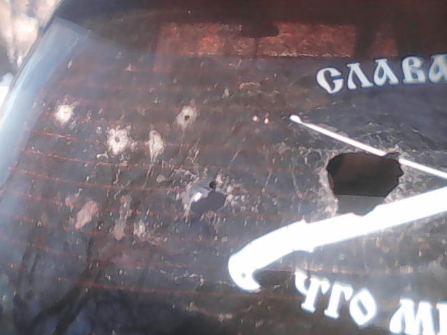 Автомобиль начальника штаба Городского казачьего общества "Форт-ДВ" г. Хабаровск. По машине было произведено более 10 выстрелов из огнестрельного оружия, которые пришлись по лобовому и заднему стеклу. Как сообщил корр. ИА AmurMedia владелец автомобиля Дмитрий Леднев, преступники намерено целились в надписи на стеклах.