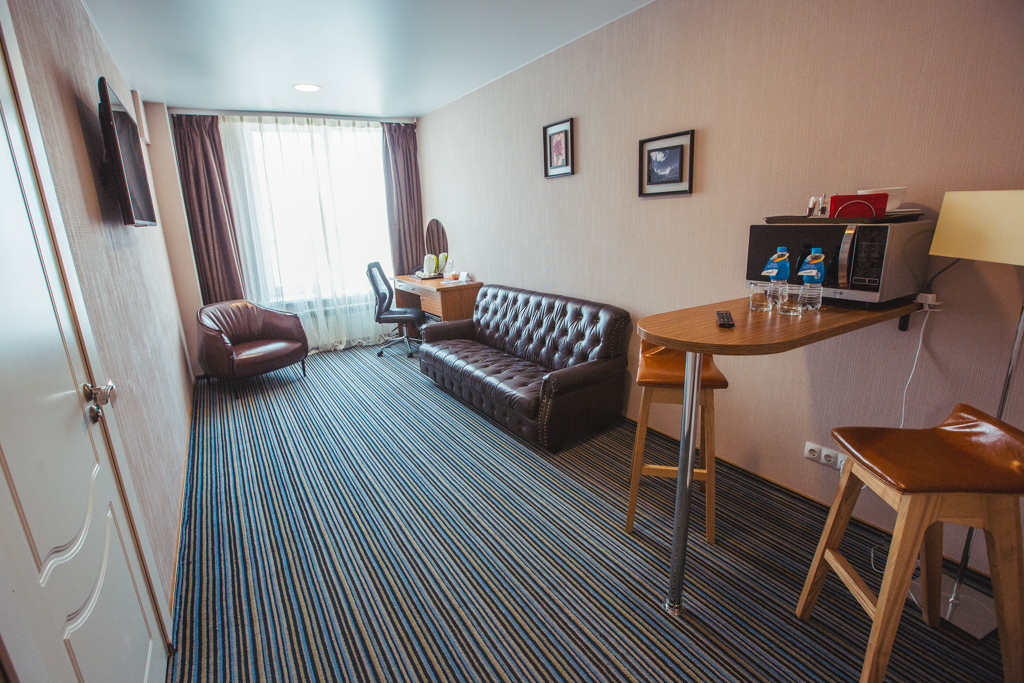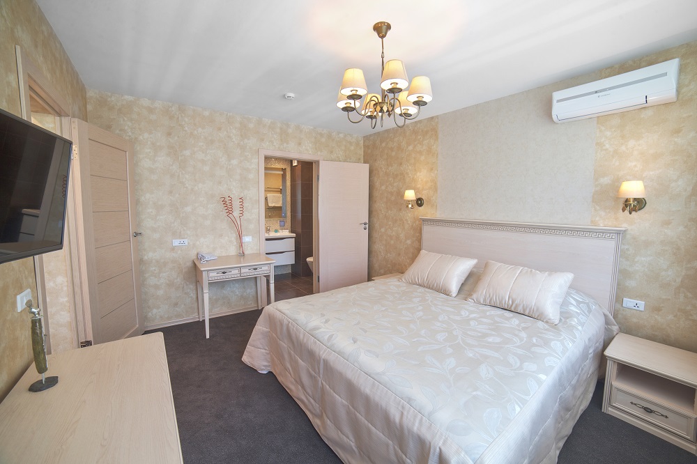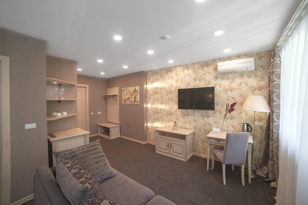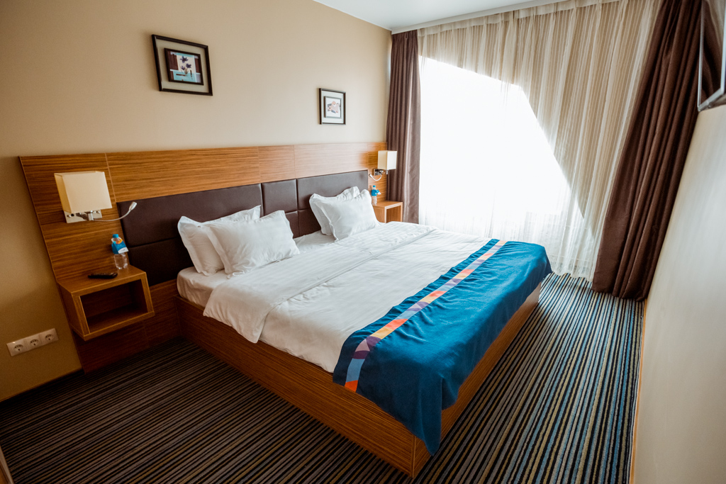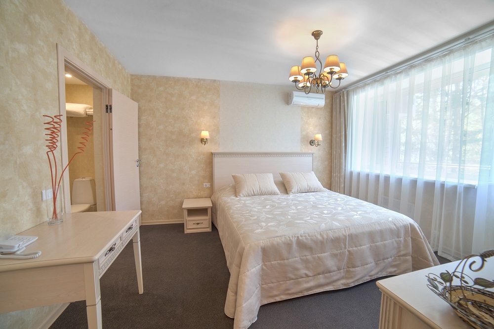 Номера сочетают в себе перечень всех необходимых составляющих для комфортного и безопасного отдыха: оптимальный размер комнат, современный дизайн, эргономичная мебель, ЖК-телевизор, телефон, отопление, кондиционер, сейф, электрический чайник, бутиллированная вода, разовые гигиенические принадлежности, бесплатный WI-FI, фен, тапочки, ванная комната с душем, балкон.