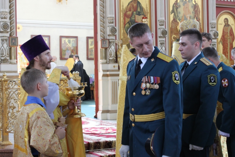 Всех военнослужащих, а также обычных прихожан, собравшихся в стенах Спасо-Преображенского собора, священнослужители щедро окропили святой водой.