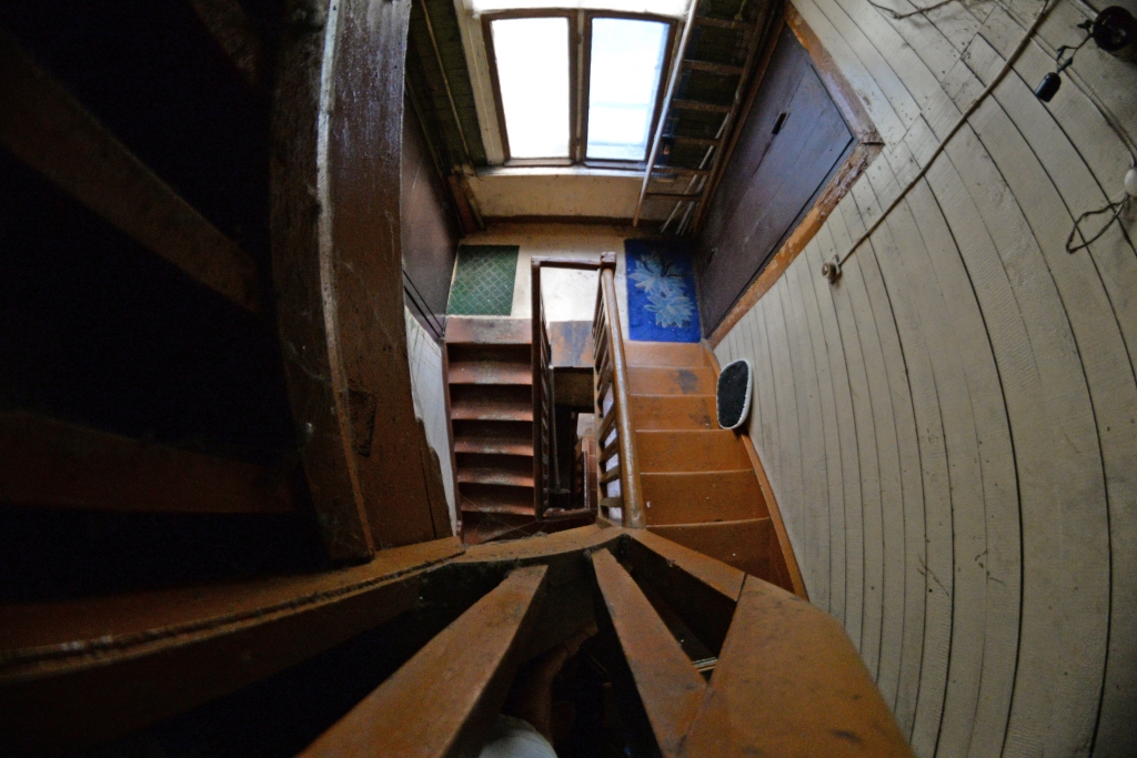 Еще несколько десятков лет назад дом представлял из себя типичное новое строение с характерными архитектурными признаками того времени — каменный фундамент, резные элементы, деревянное основание. Сейчас ветхий, выкрашенный в яркий бирюзовый цвет, дом выглядит довольно прилично. Но стоит только присмотреться — тут и трещины, и покосившиеся углы, и подгнившие балки.
