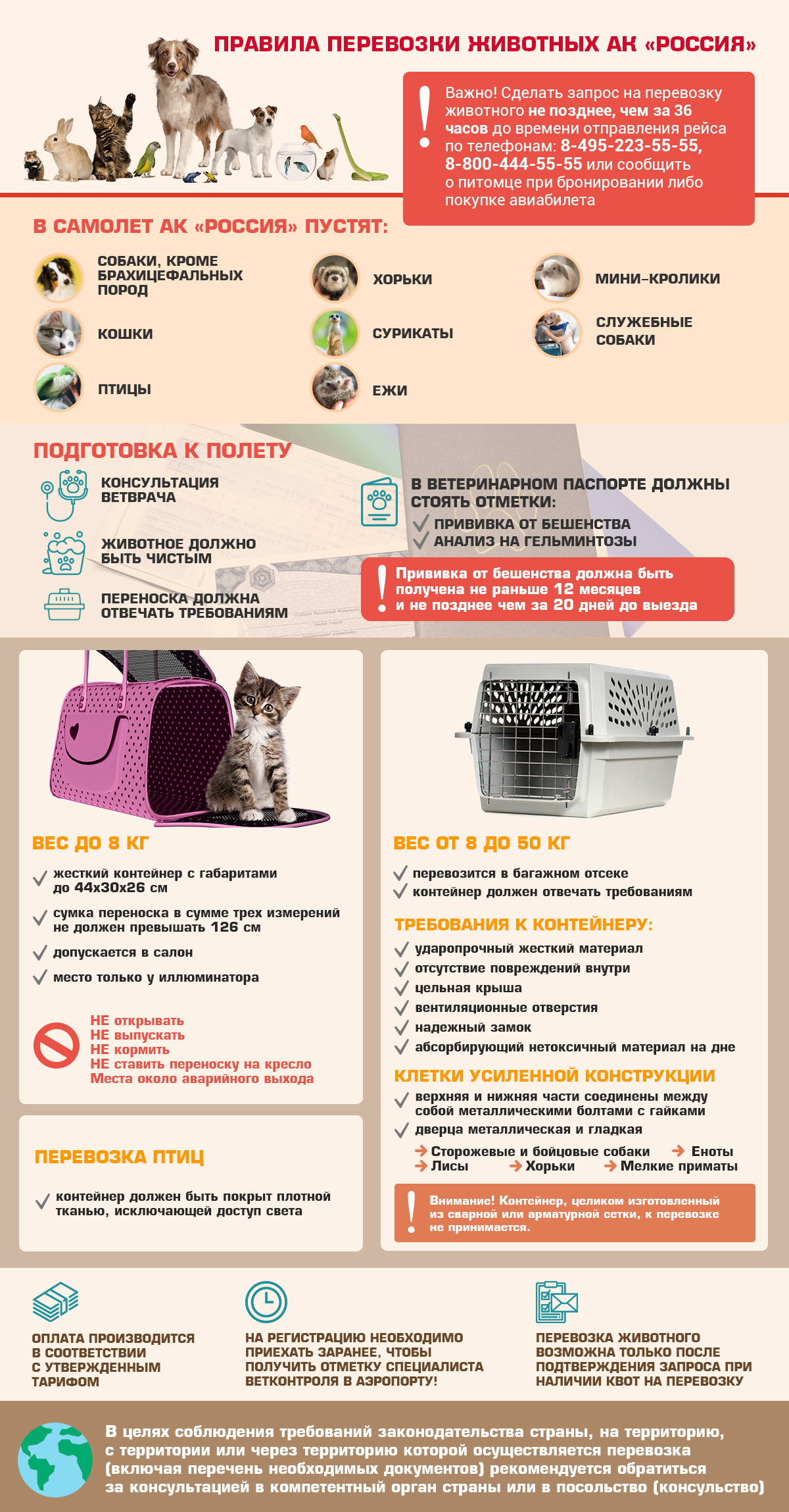 К перевозке на борту самолета принимаются кошки, собаки, птицы и другие комнатные животные: хорьки, фретки, фенеки, еноты, лисы, лори, декоративные ежи, мини-кролики, игрунки и другие. А вот перевозка собак брахицефальных пород с короткой и приплюснутой мордой: бульдогов (английских, французских, американских), мопсов, пекинесов, ши-тцу, боксёров, грифонов (бельгийских, брюссельских), бостон-терьеров, бордосских догов, японских хинов, в связи с особенностями дыхательных путей и повышенной чувствительности к перепадам температуры и давления запрещена.