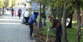 В центре города основной трудовой десант был брошен на уборку листвы с газонов