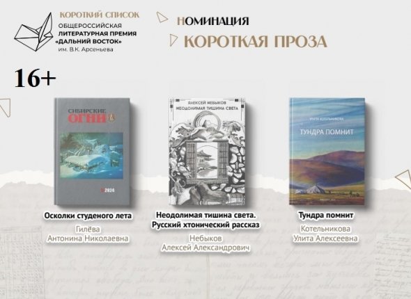 PrimaMedia, 19 ноября. 80 заявок от авторов из 15 регионов России, Китайской Народной Республики, Республики Корея и Республики Казахстан поступили на соискание Общероссийской литературной Премии "Дальний Восток" им. В.К. Арсеньева (16+) в 2025 году. Девять произведений — и, соответственно, их авторы — вышли в финал творческого конкурса, который, напомним, проводится в трех номинациях — "Длинная проза", "Короткая проза" и "Проза для детей".