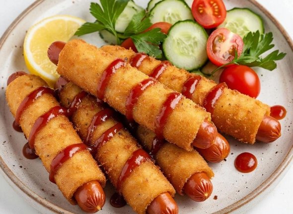 Сосиски обваливаем в муке, насаживаем на деревянную шпажку и окунаем в кляр.