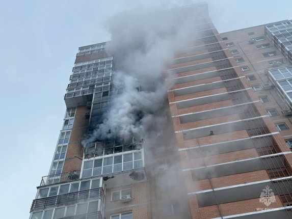 Возгорание произошло в квартире на 13-ом этаже, также от пламени пострадал балкон квартиры на вышестоящем этаже. На месте работают 21 сотрудник и 6 единиц техники.