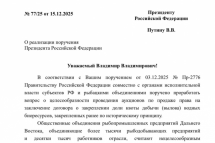 — Координационный совет общественных рыбохозяйственных организаций Дальнего Востока, куда также вхожу и я, как Президент Ассоциации предприятий рыбной отрасли Хабаровского края, написал обращение главе государства и Председателю правительства РФ, в котором представлены доводы о нецелесообразности проведения подобных аукционов. — написал в своём Telegram-канале президент Ассоциации предприятий рыбной отрасли Хабаровского края Сергей Рябченко.