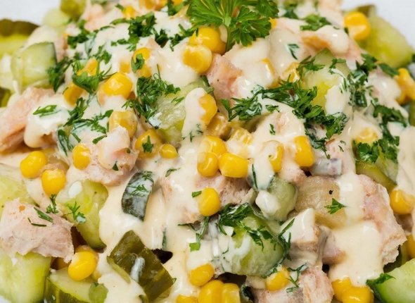 Оригинальность вкуса этого салата обеспечивают самые заурядные продукты. Салат базируется на сочетании солёного со сладким и ярком оттенке подкопчёной рыбы.