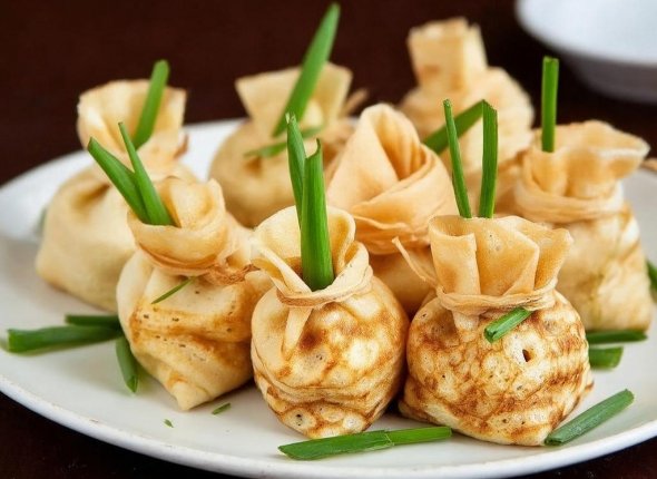 В каждый блинчик кладите начинку, формируя из них мешочки и перевязывая пером зелёного лука. Готово!
