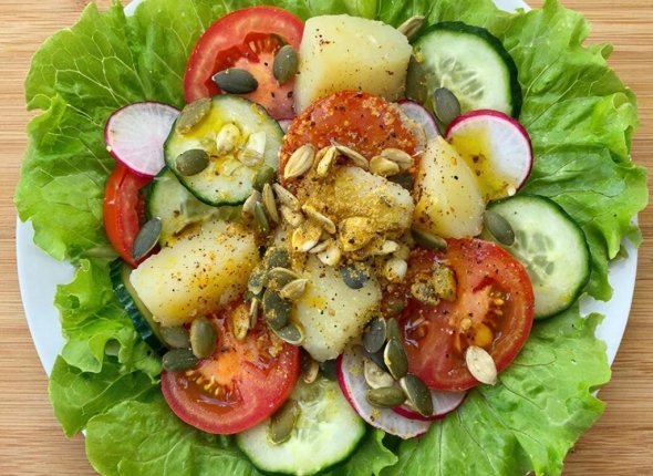 Тонкими ломтиками нашинкуйте огурцы, помидоры, редис. Картофель нарежьте кубиком. Всё аккуратно перемешайте.
