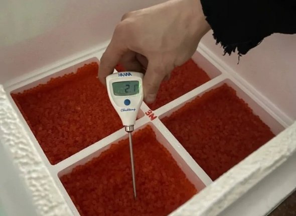 На период транспортировки оплодотворенная икра помещена в специальные изотермические контейнеры, каждый из которых пронумерован и маркирован этикеткой. Соблюдены условия и режим перемещения икры — температура внутри контейнера в верхних лотках + 3,5-3,7°С, в нижних лотках +3,5-3,7°С.