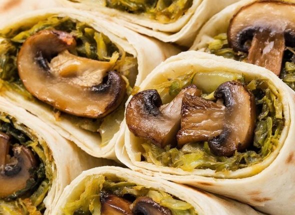 Всё просто, вкусно и постно. Тонкий лаваш сворачивают рулетом с начинкой из обжаренных грибов, квашеной капусты и лука. Рулет нарезают, укладывают в форму и заливают соусом из аквафабы — жидкости из банки консервированной фасоли. После запекания получается нечто вроде пирога.