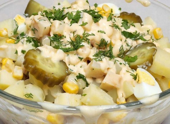 Комбинация картофеля, яиц, кукурузы и соленых огурцов рождает сбалансированное угощение с весьма интересным гастрономическим характером. В этом составе нежность основы подчеркивается сладостью кукурузных зерен, сочностью маринованных овощей и легкой остротой лука. Итоговый вкус формирует нестандартная заправка из смеси майонеза, сметаны, горчицы и сока лимона, в которую для баланса добавлена небольшая порция сахарной пудры.