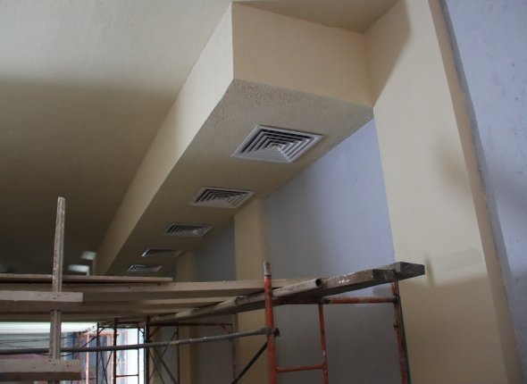На сегодняшний день строительная готовность высокая: на втором этаже установлены новые дверные блоки, уложена плитка, в залах смонтирована современная система вентиляции, ведется отделка стен и потолков. После укладки напольного покрытия начнется этап оснащения современным оборудованием.